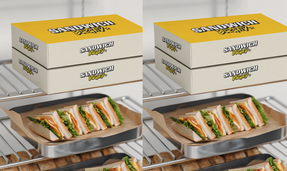 1 crisp PSD scene with sandwich packaging, fresh layers of lettuce, cheese, and tomato, styled in natural lighting and minimal shelving. Just add your design, and you’ve got mouthwatering, realistic visuals in seconds.